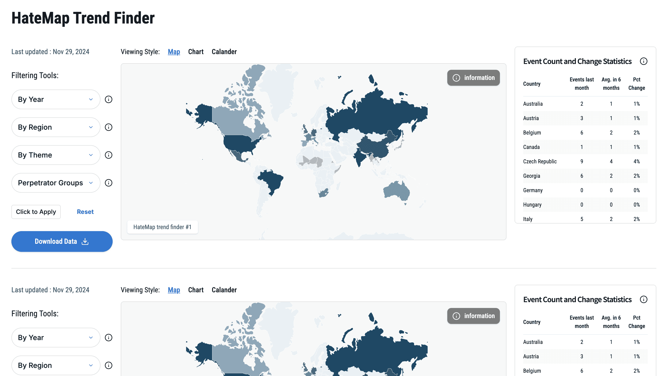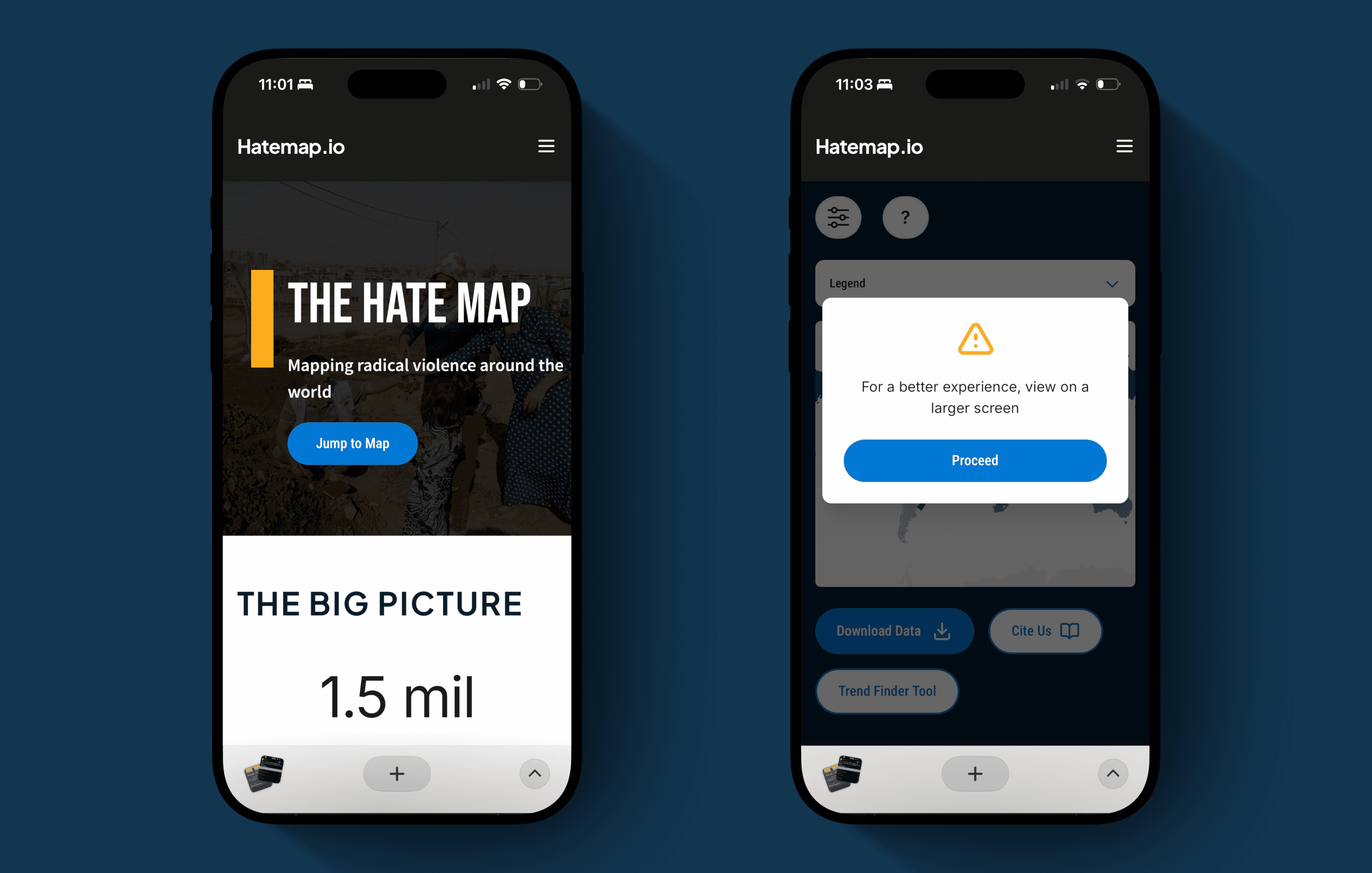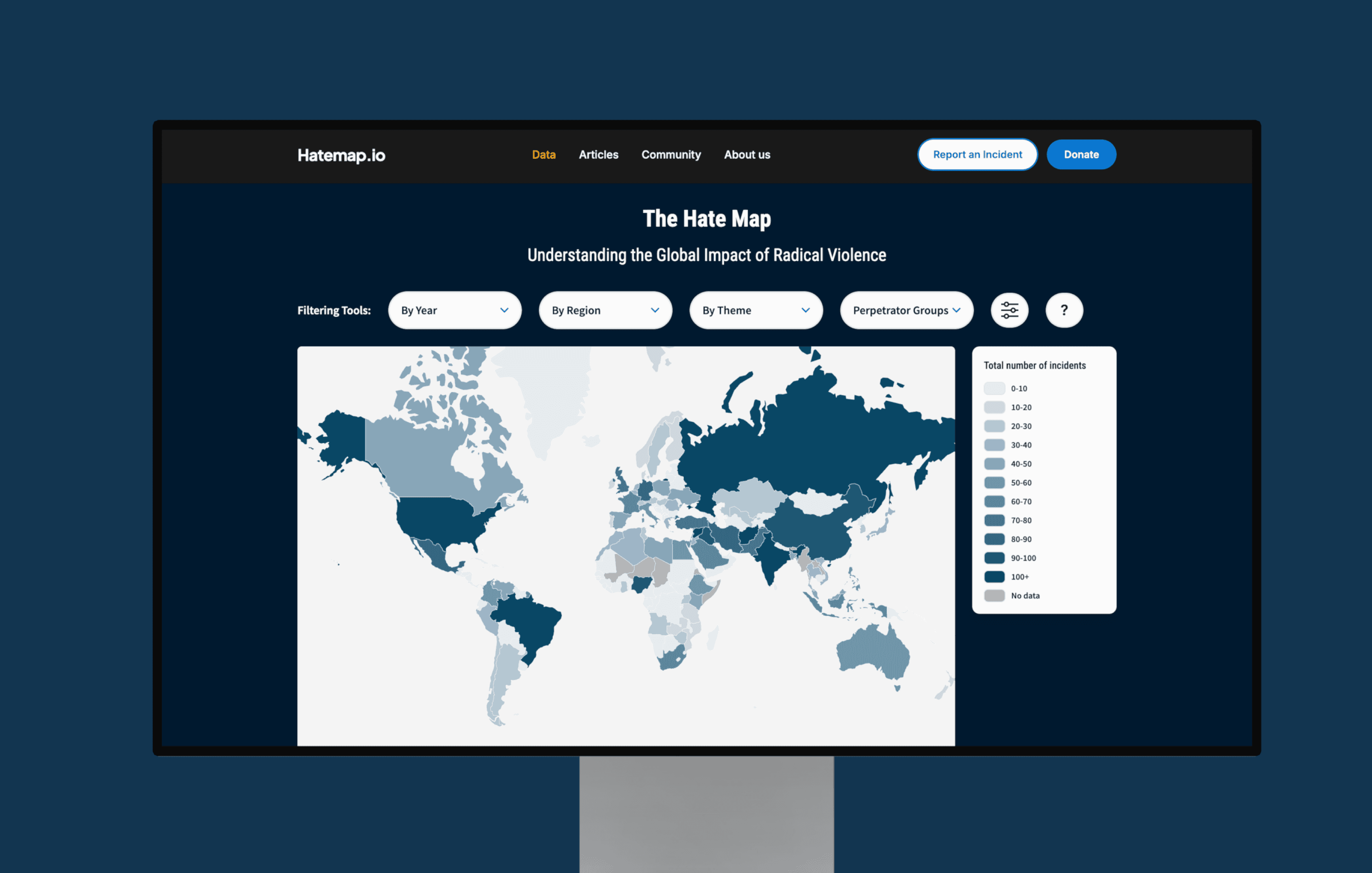 We collaborated with Bjørn Ihler, a counter-terrorism and peace activist and co-founder of the Khalifa Ihler Institute. And together, we were tasked with enhancing Hatemap.io - the website which hosts their data visualization project “The Hate Map,” which tracks and visualizes hate crimes worldwide through interactive maps and dynamic data displays.