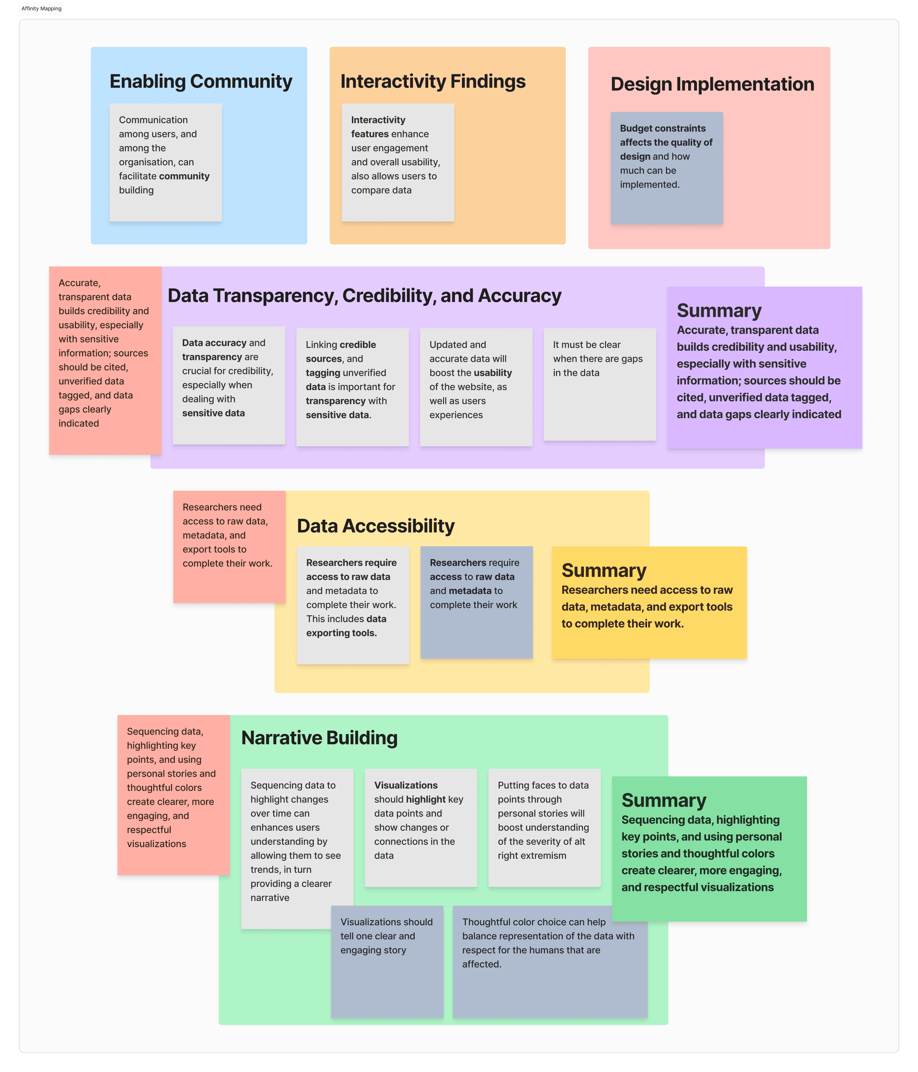 We distilled our research into six key themes that shaped the product direction - emphasizing data transparency, accessibility, and narrative clarity. This helped us prioritize what users actually need, not just what looks good.